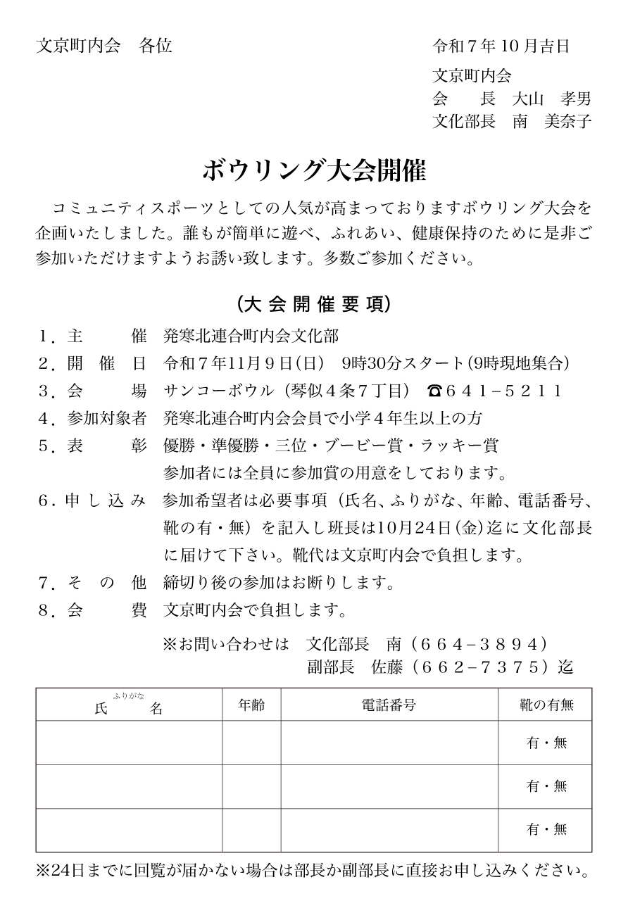 パークゴルフ大会、ボーリング大会、麻雀大会など連合町内会の行事運営に参加・協力。