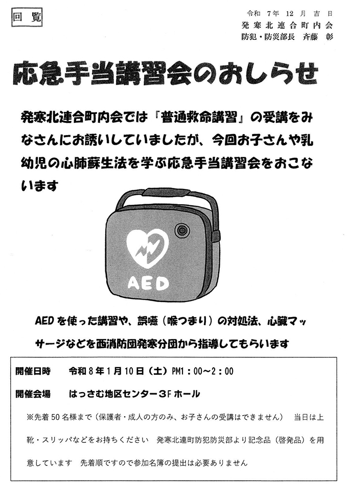 防犯と防災に関する行事の実施。救命講習会・防災訓練の参加、地域青色回転灯防犯パトロールの実施。